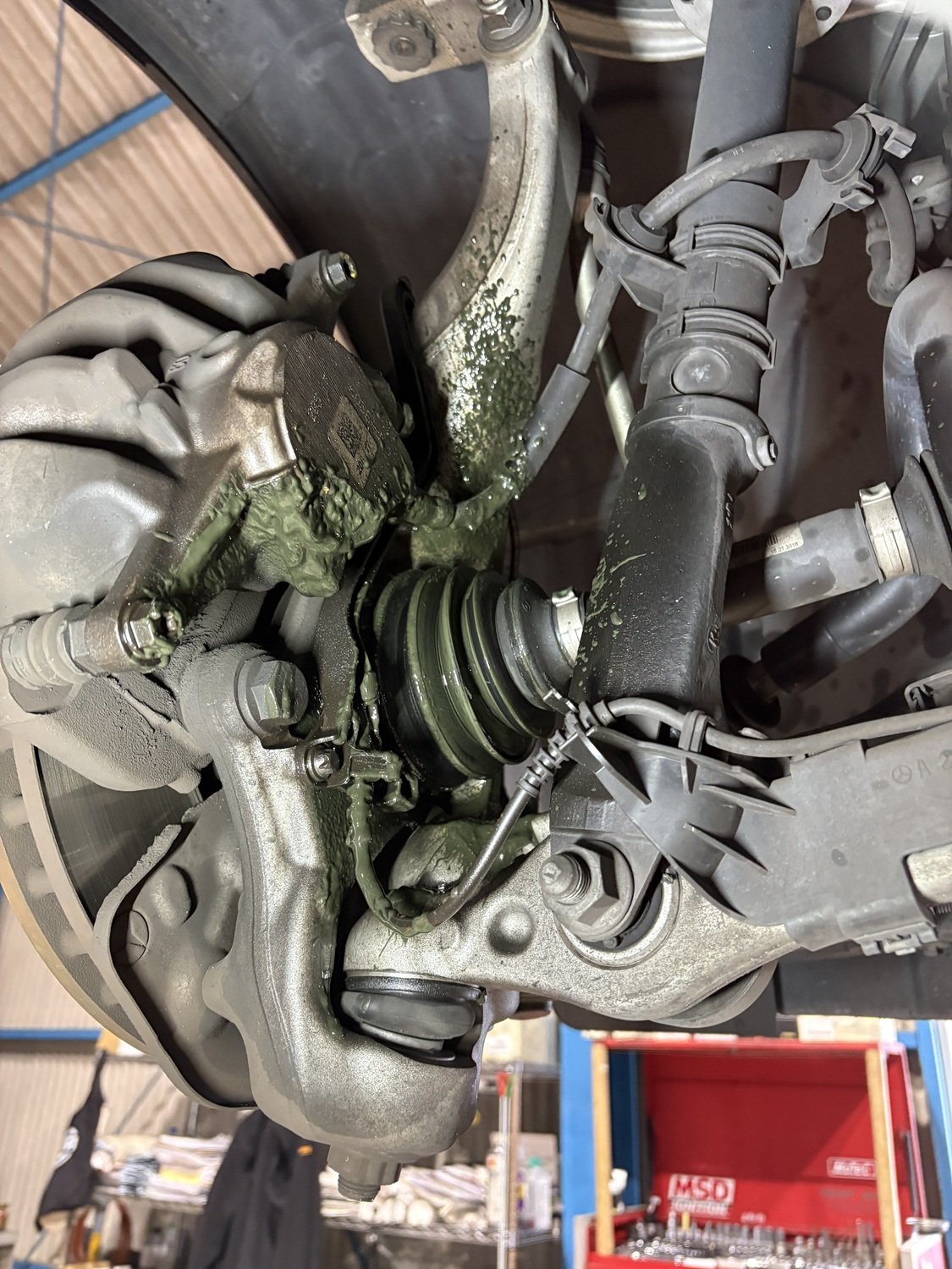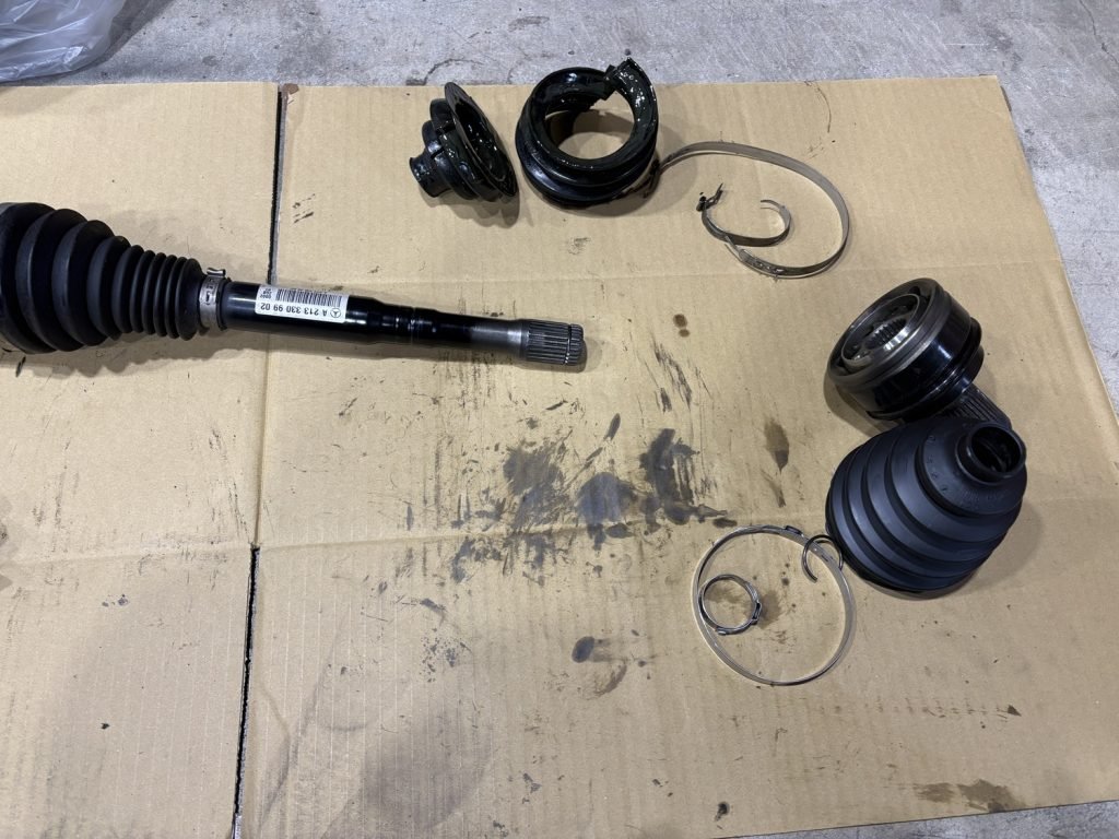 最近のメルセデスでは4MATICに限ってドライブシャフトブーツ単体でのパーツが供給されておりません。そのためドライブシャフトブーツに亀裂や劣化が見られた場合はシャフトをそっくり交換するという作業が採用されています。